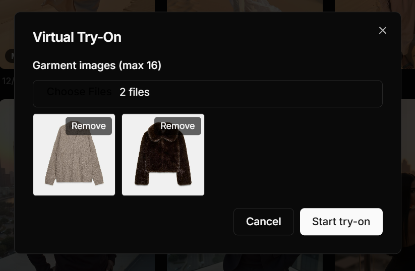 After uploading your garment images and reviewing them in the preview grid, click the "Start try-on" button.