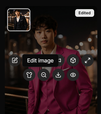 Hover over any AI-generated photo in the Studio tab. You'll see an "Edit image" tooltip appear. Click on it to open the editing modal.