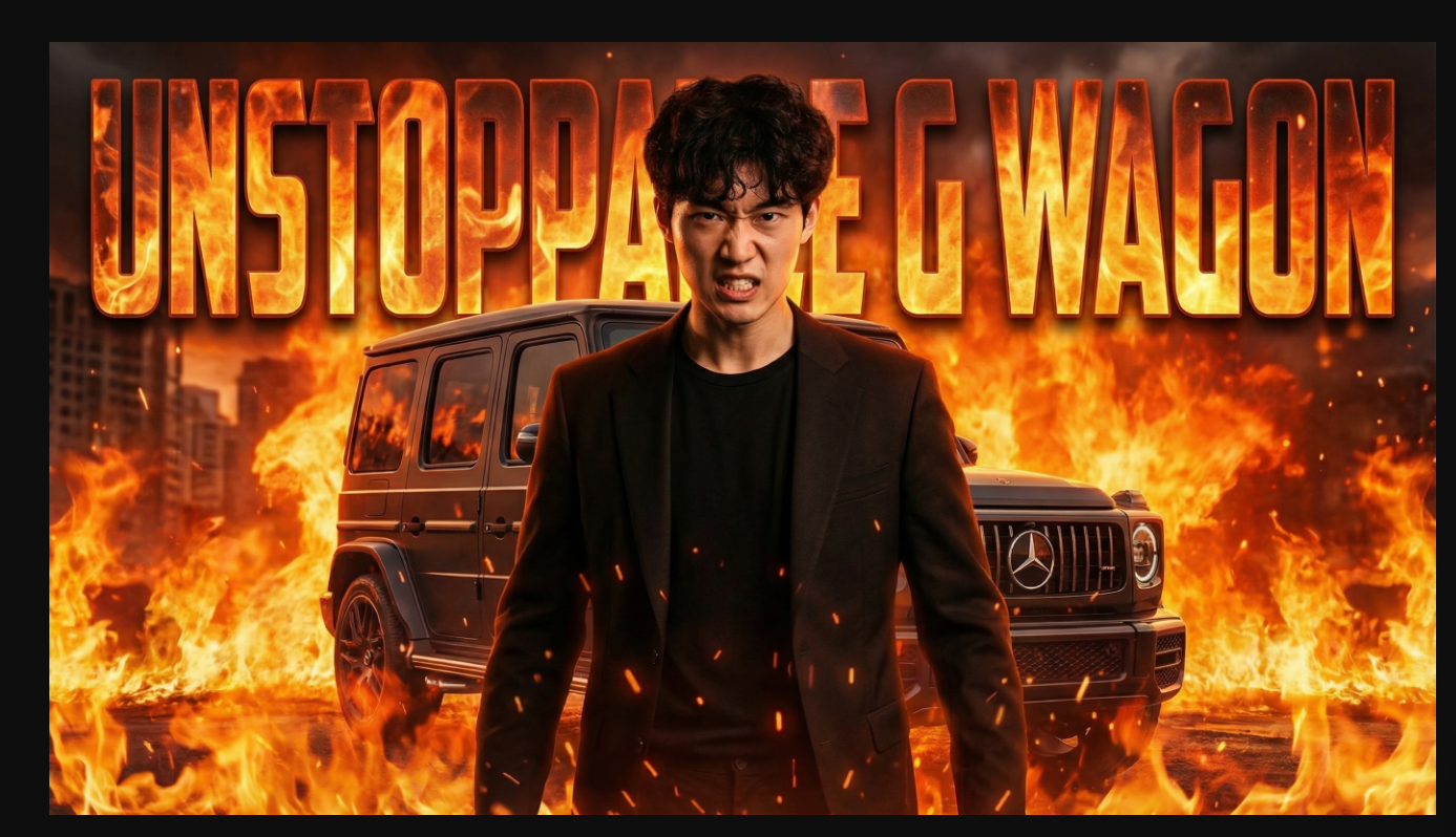 A YouTube video thumbnail of a young man. Put the background on fire, he looks furious, and a Mercedes G is behind him. Text behind him reads "Unstoppable G Wagon."