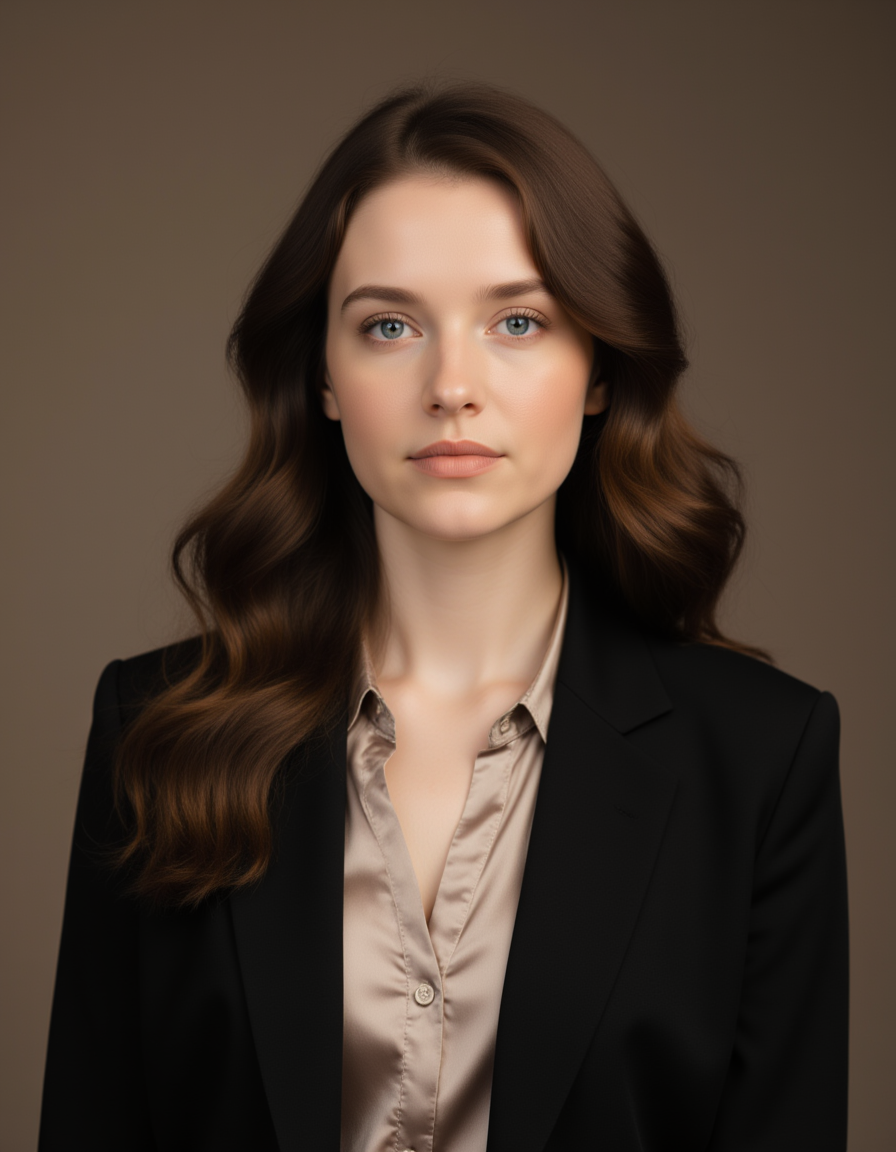 8k professional portrait, model in a tailored blazer over a silk blouse, soft curls, warm lighting, studio background, approachable yet confident look, LinkedIn-ready composition