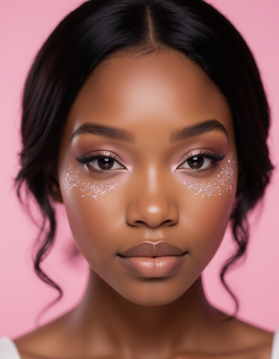 artistic makeup style with subtle face jewels under the eyes, iridescent highlighter on the temples, and a soft halo blush, captured in a tight close-up against a pastel background
