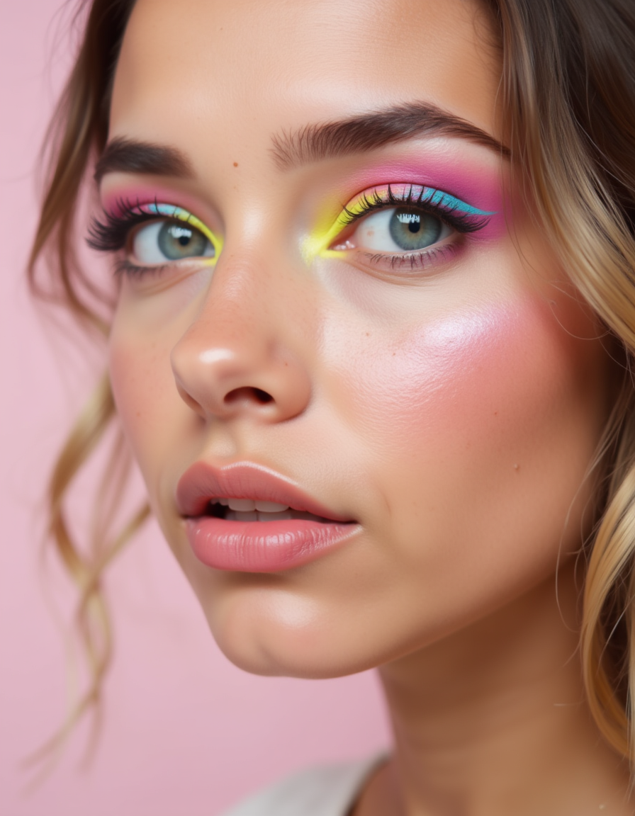beauty close-up featuring vibrant neon eyeliner, soft matte foundation, and a gradient blush that blends into the temples, set on a clean pastel backdrop