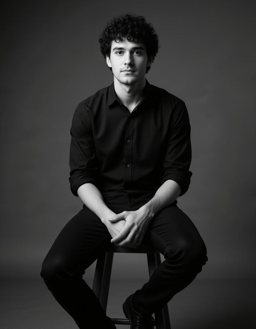 Black and white full-body portrait of a male model sitting on a stool. Relaxed yet confident posture, soft light and rich texture, timeless monochrome style.