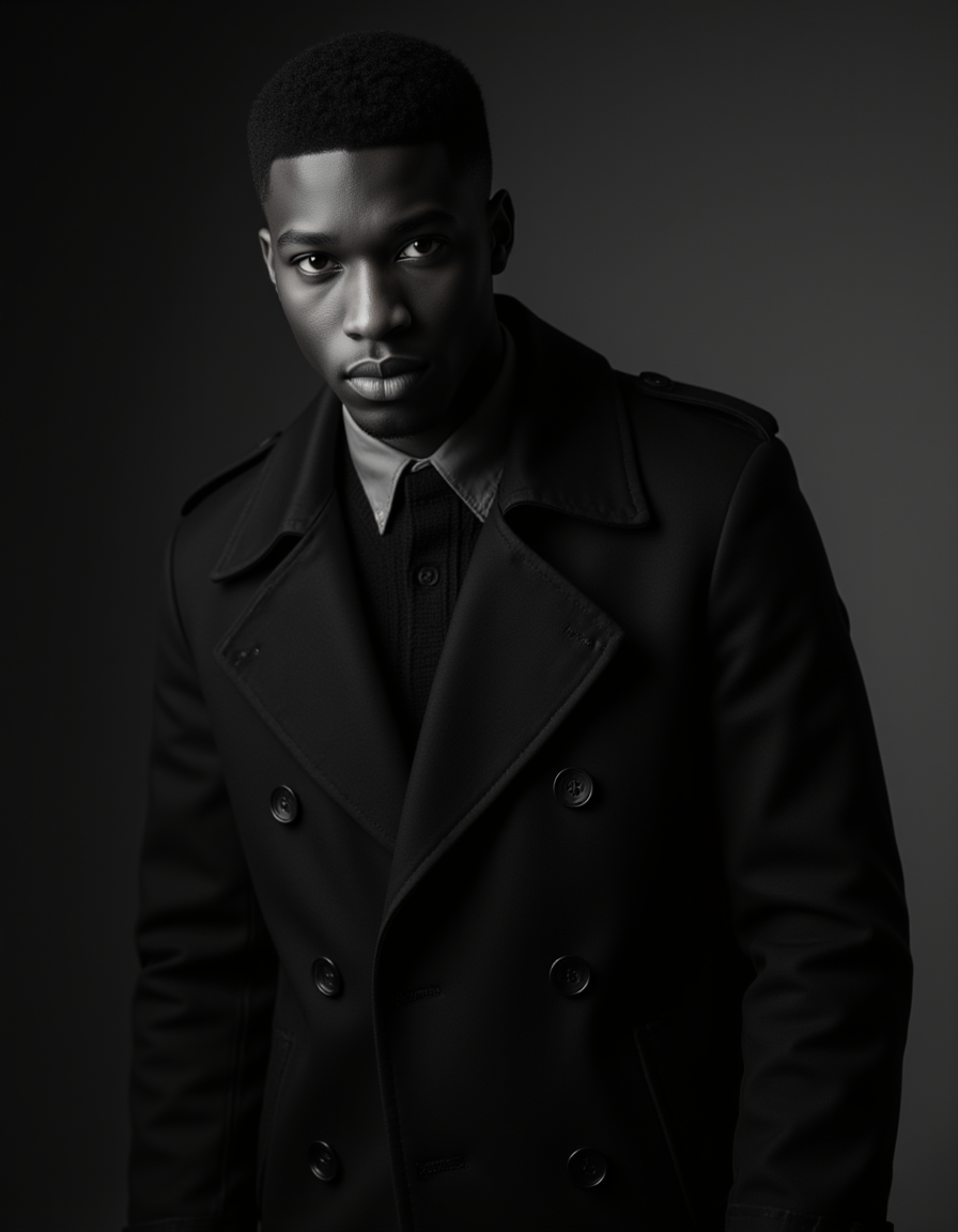 Black and white portrait of a male model in a trench coat. Intense gaze, moody atmosphere, high-contrast lighting, artistic noir style.