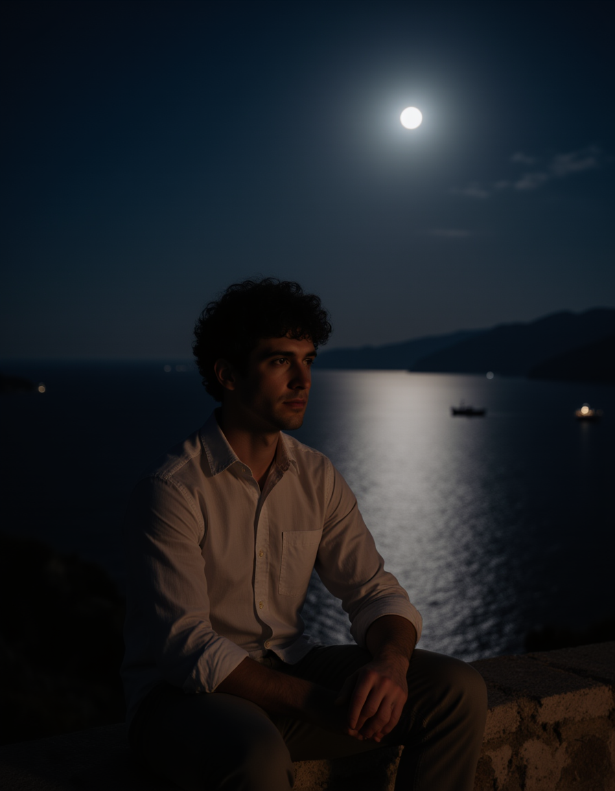a contemplative subject sitting on an ancient stone wall overlooking the dark Aegean Sea, moonlight reflecting heavily on the water, a light breeze rustling a loose linen shirt, with the distant lights of a fishing boat visible