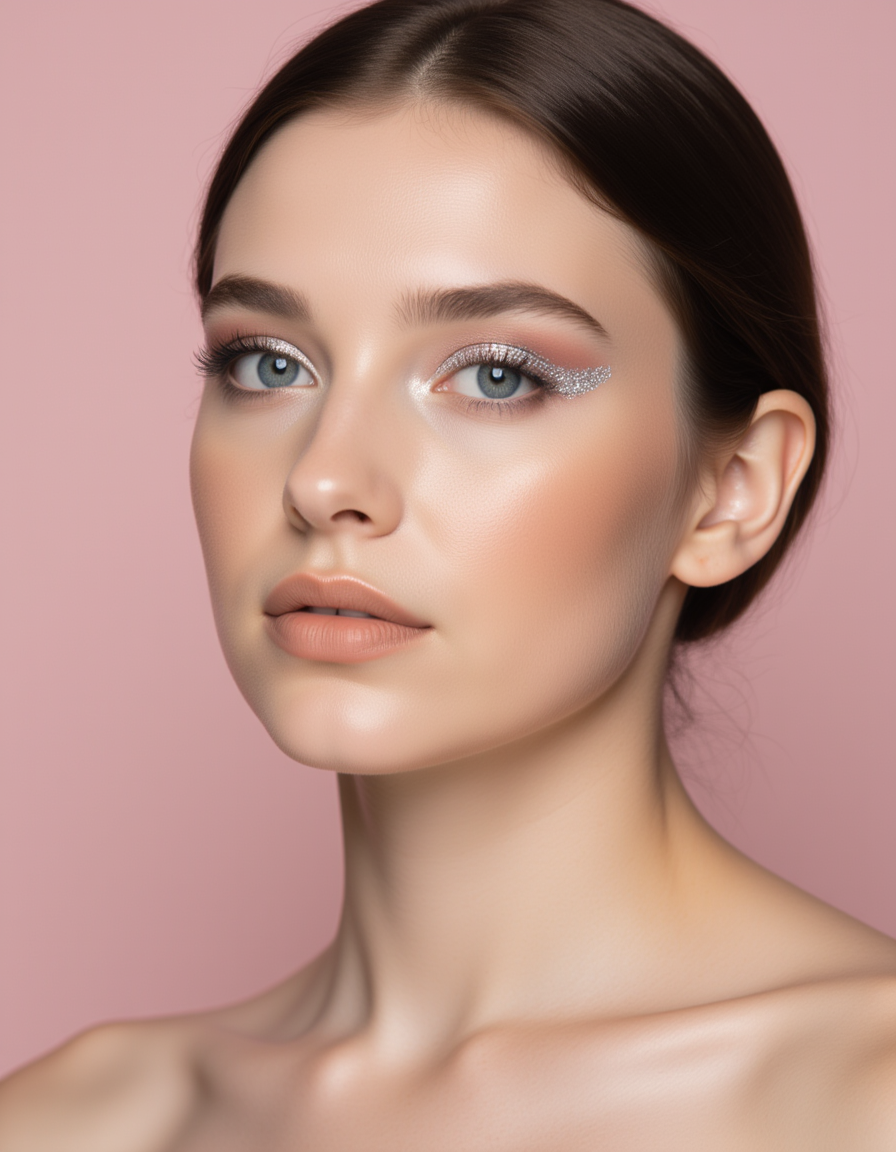 creative makeup look with sparkling silver inner-corner highlight, gradient blush across the cheeks, and a soft glossy lip tint, photographed against a subtle pastel backdrop