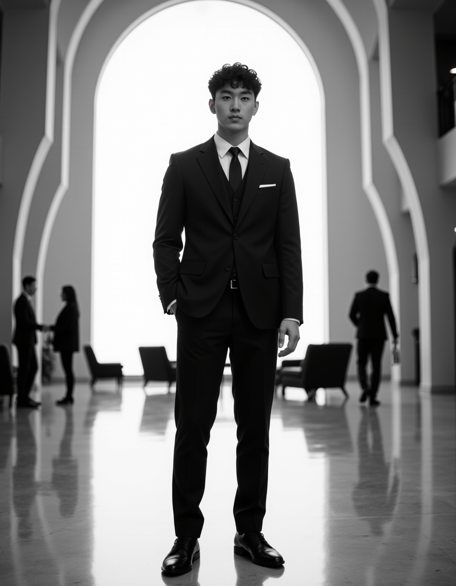 Dubai architectural interior photoshoot, monochrome tailored outfit, standing inside a vast futuristic lobby with dramatic lines and symmetry