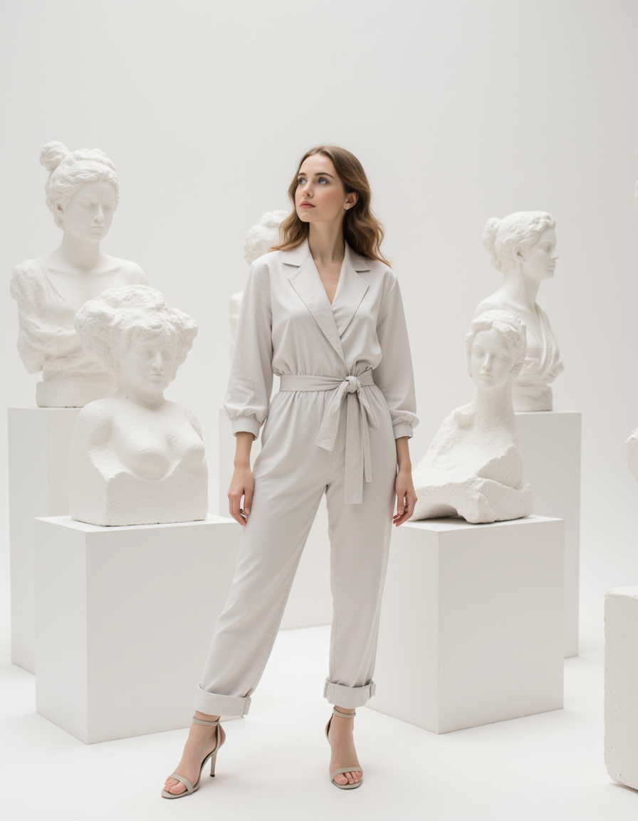 Dubai art gallery lifestyle portrait, sculptural high-fashion outfit, standing among contemporary installations, clean white space with strong editorial composition