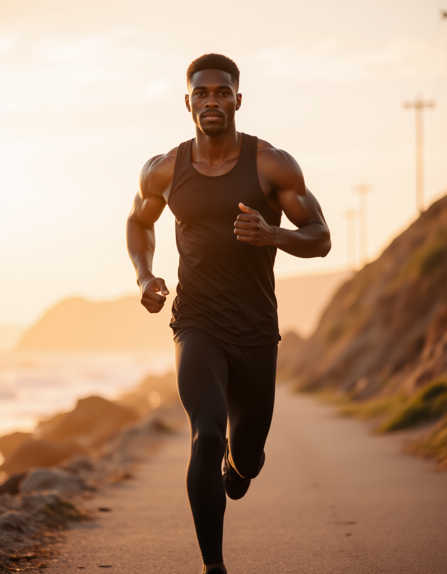 a dynamic masculine model jogging along a coastal path, wearing performance running gear, with sweat-glistened skin and an invigorated expression under golden hour light