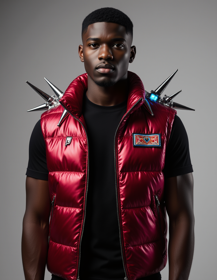 dynamic pose in a metallic crimson vest with oversized shoulder spikes, LED patches flickering across the chest, bold cybernetic eye makeup reflecting magenta neon