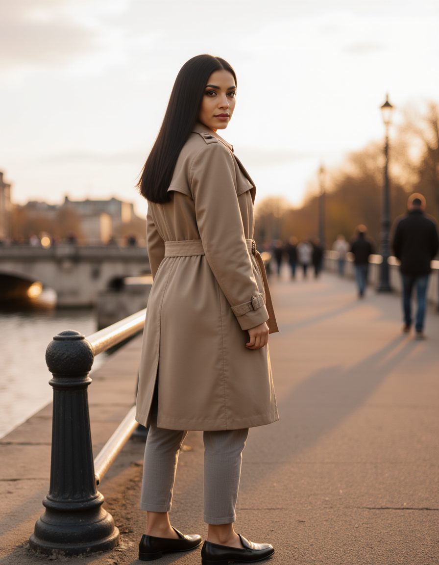 An effortlessly chic model pausing on a bridge over the Seine in Paris during golden hour, wearing a classic beige trench coat belted over tailored trousers and loafers, looking back over her shoulder at the lens, classic Haussmannian architecture defining the background, capturing the essence of AI Street Style Photos