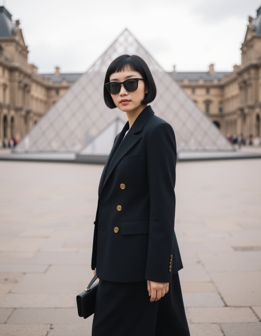 An effortlessly chic model posing in the Cour Napoléon of the Louvre in Paris, with the iconic glass pyramid structure directly behind her. She wears a monochrome tailored suit with statement sunglasses (eyes visible over the rim) looking at the lens, surrounded by the historic palace architecture, capturing the essence of AI Street Style Photos.