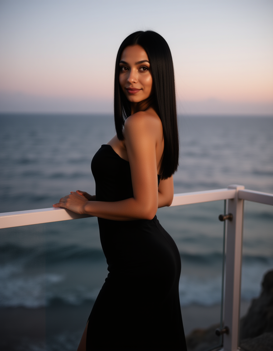 an elegant feminine model posing on a balcony overlooking the ocean at dusk, dressed in a sleek black maxi dress, exuding poise and mystery with a gentle smile