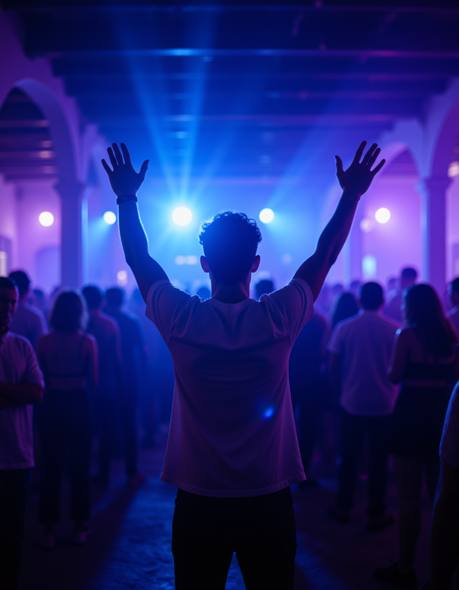 an energetic individual right in the center of a packed open-air dance floor, hands in the air, illuminated by flashing blue and magenta strobe lights reflecting off whitewashed architectural arches, capturing the intense vibe of AI Mykonos Nights Photos