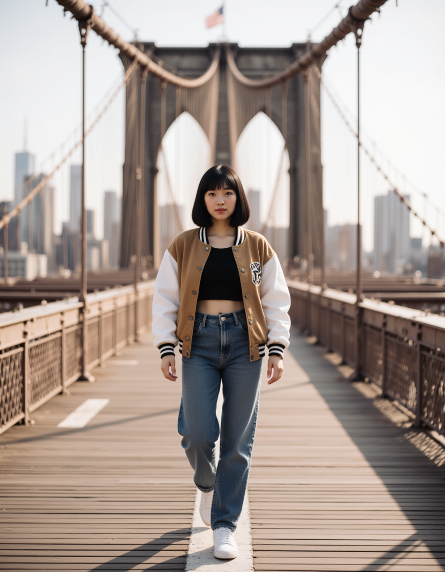 A fashionable model caught mid-stride on the wooden promenade of the Brooklyn Bridge in New York City, wearing an oversized vintage varsity jacket over a crop top and baggy cargo jeans. She is looking directly at the camera with a confident smile, with the complex web of bridge cables and the Manhattan skyline in the background under bright daylight.