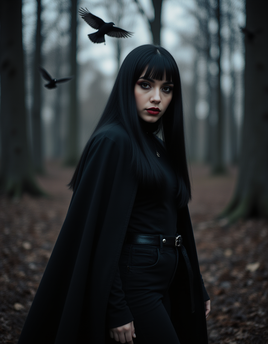 female goth model with jet-black hair, red eyeshadow, and heavy eyeliner, wearing a long tattered cloak, standing in a moonlit forest with crows circling overhead, eerie, seductive, and hauntingly beautiful gothic vibe.