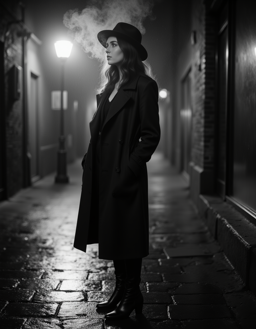 female model as a femme fatale standing under a flickering streetlamp in the rain, wearing a long trench coat and fedora, cigarette smoke curling around her face, reflections on wet cobblestone streets, cinematic black and white film noir style
