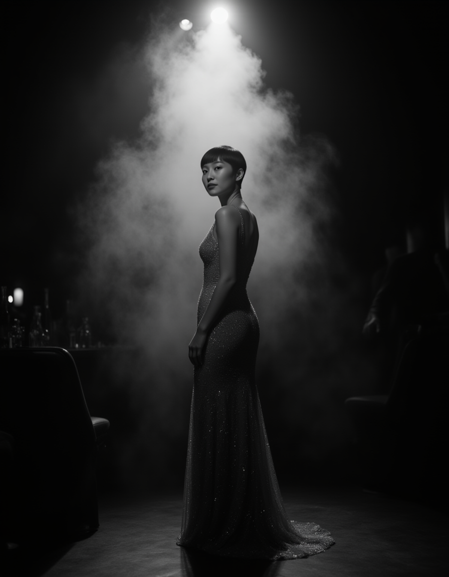 female model as a glamorous nightclub singer on stage, wearing a sparkling gown and vintage hairstyle, spotlight illuminating her as smoke drifts across the scene, moody 1940s film noir lighting in black and white