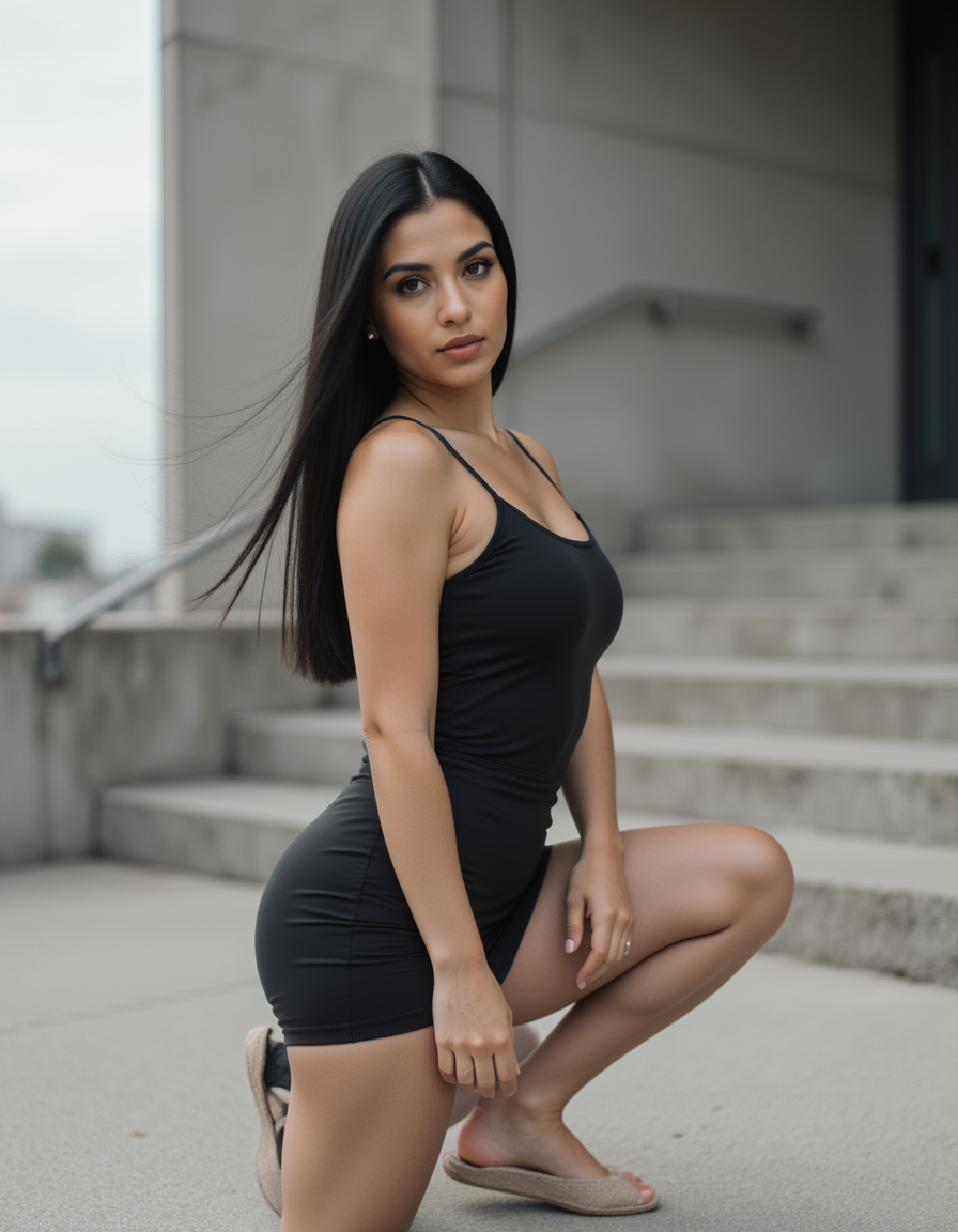 Female model posing against a modern architectural backdrop. Chic outfit, clean lines, confident expression. Minimalist fashion photography style.