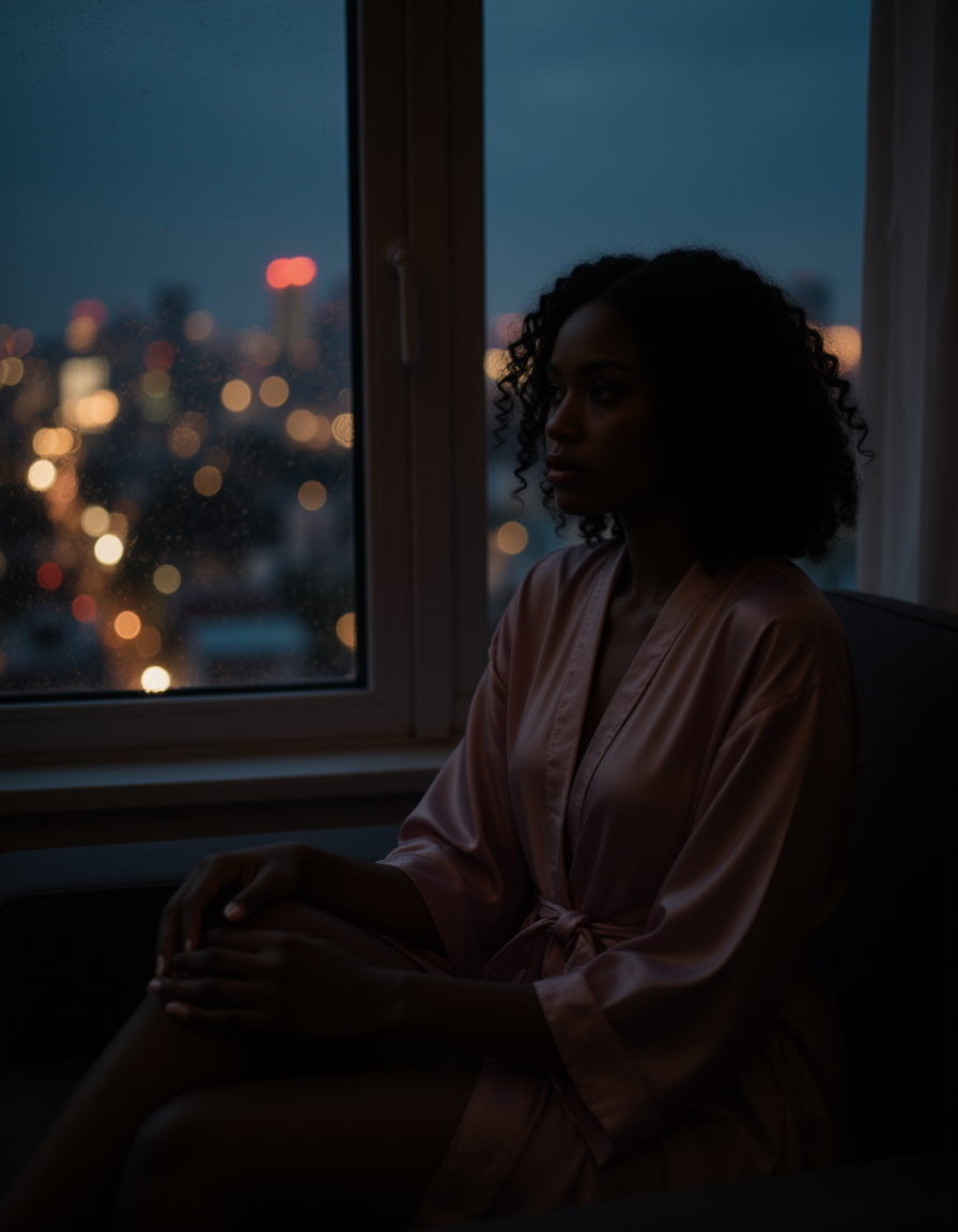 female model sitting by a rain-streaked window in a dim apartment, wearing a silk robe and vintage curls, city lights faintly glowing outside, deep shadows and dramatic composition in film noir style