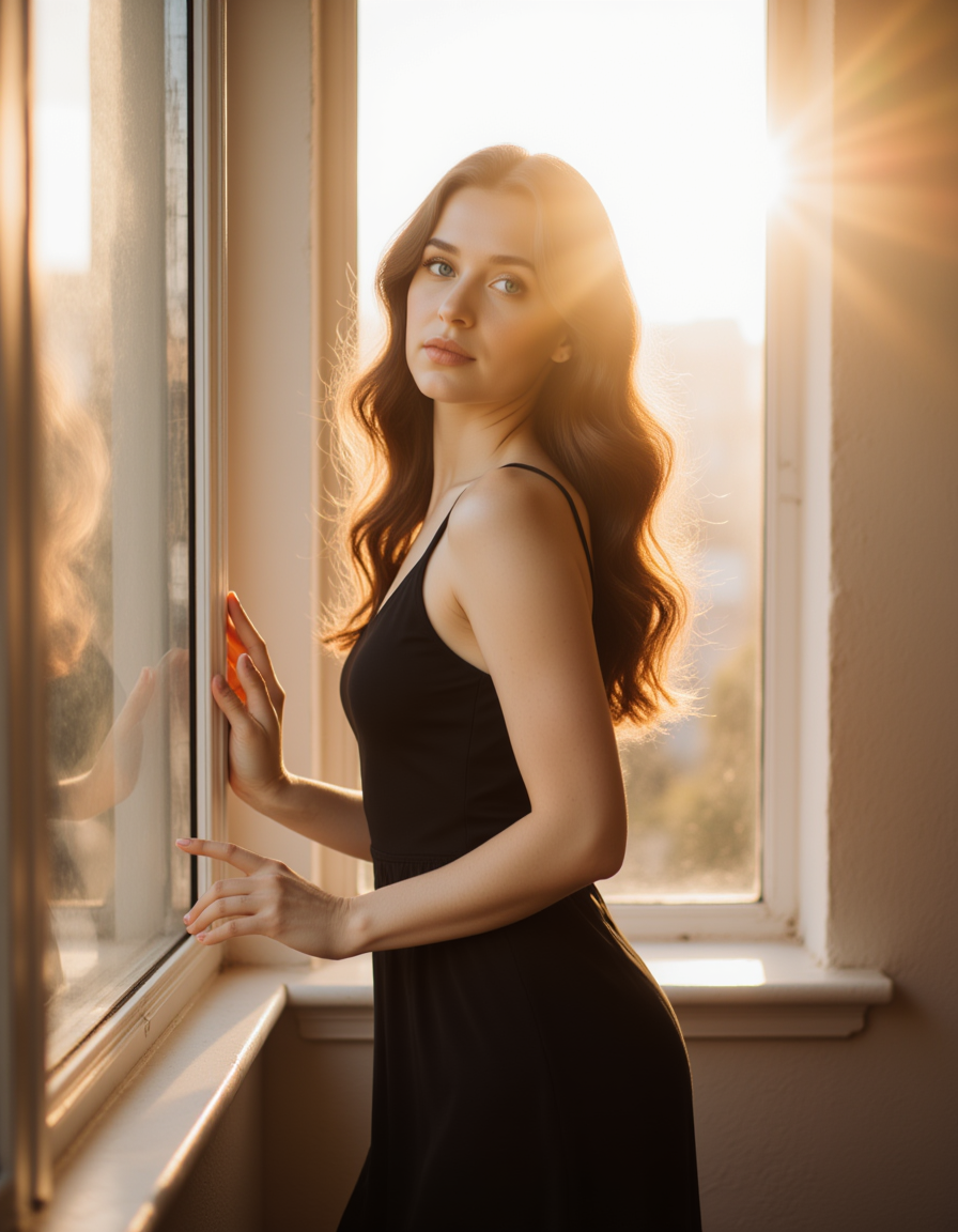 Female model standing near a window with sunlight streaming in. Gentle pose, natural glow, cinematic lifestyle photography.