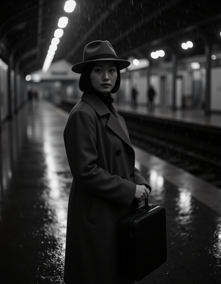 female model standing at a rain-soaked train station at night, wearing a long trench coat and wide-brimmed hat, holding a suitcase, dim light reflecting on the wet platform, dramatic black and white cinematic atmosphere