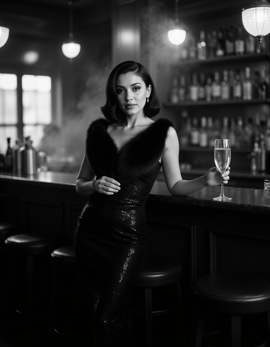 female model standing at a vintage bar counter, wearing a sequined evening gown and fur stole, glass of champagne in hand, smoke drifting through dim light, glamorous 1940s film noir composition in black and white