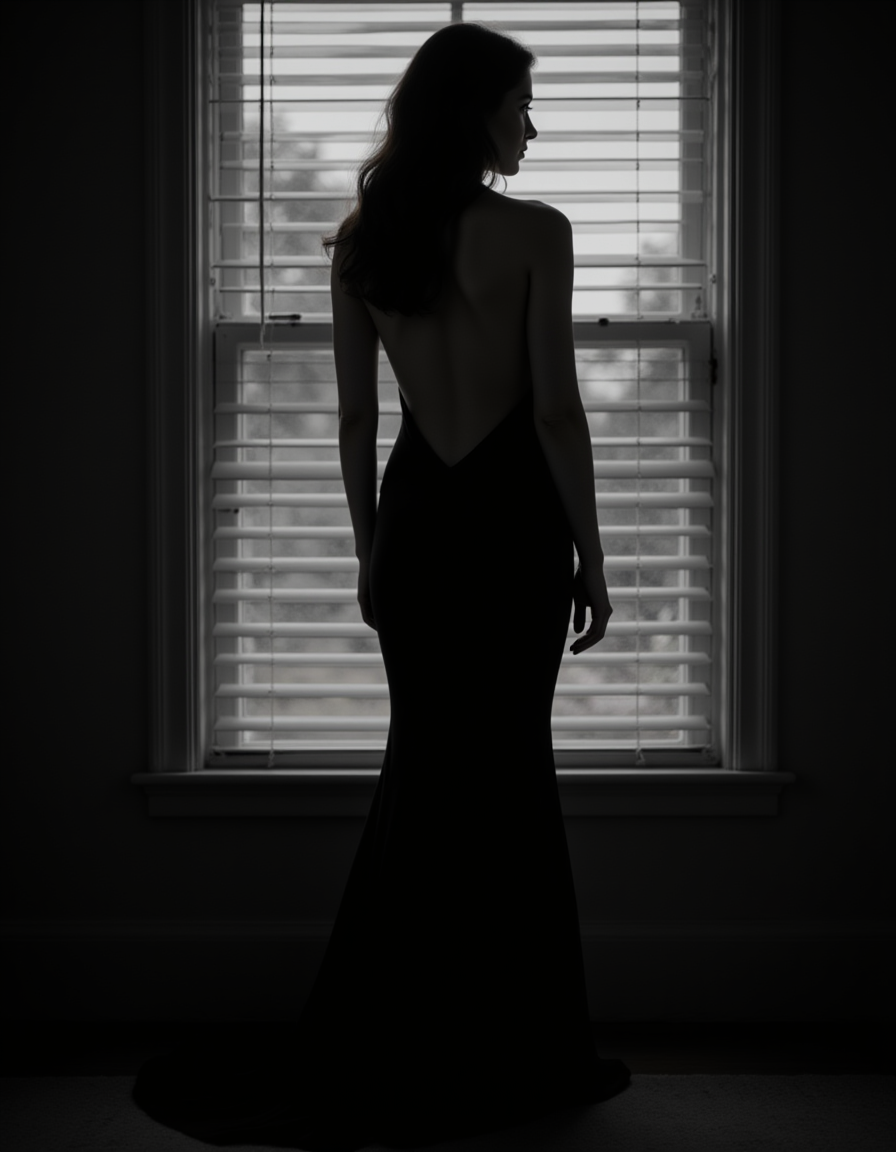female model standing by a window with venetian blinds, wearing a backless evening gown, soft moonlight illuminating her silhouette, mysterious and elegant pose captured in high-contrast black and white photography