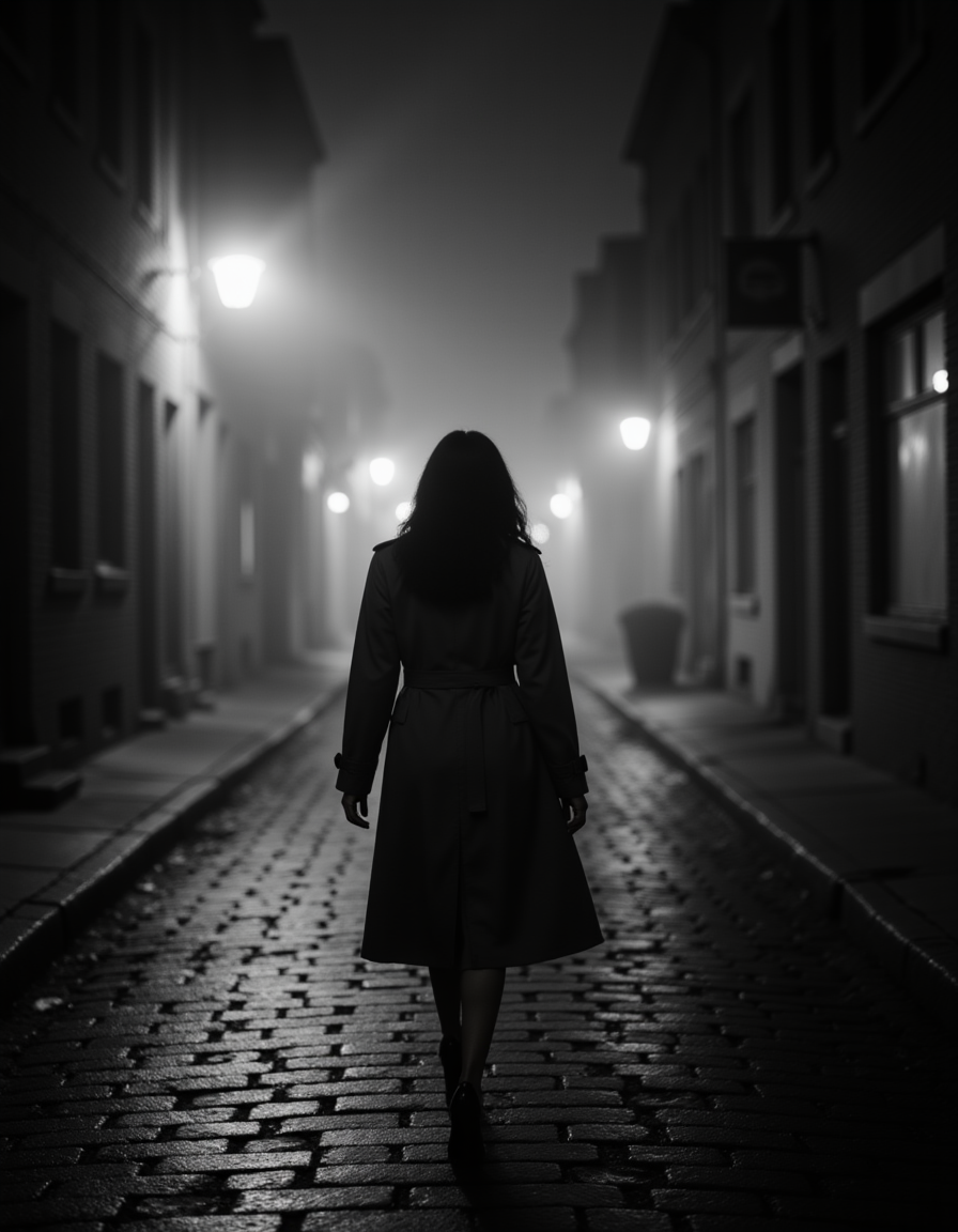 female model walking alone down a cobblestone street at night, wearing a trench coat and heels, fog surrounding her as she glances back, cinematic monochrome scene inspired by 1940s noir thrillers