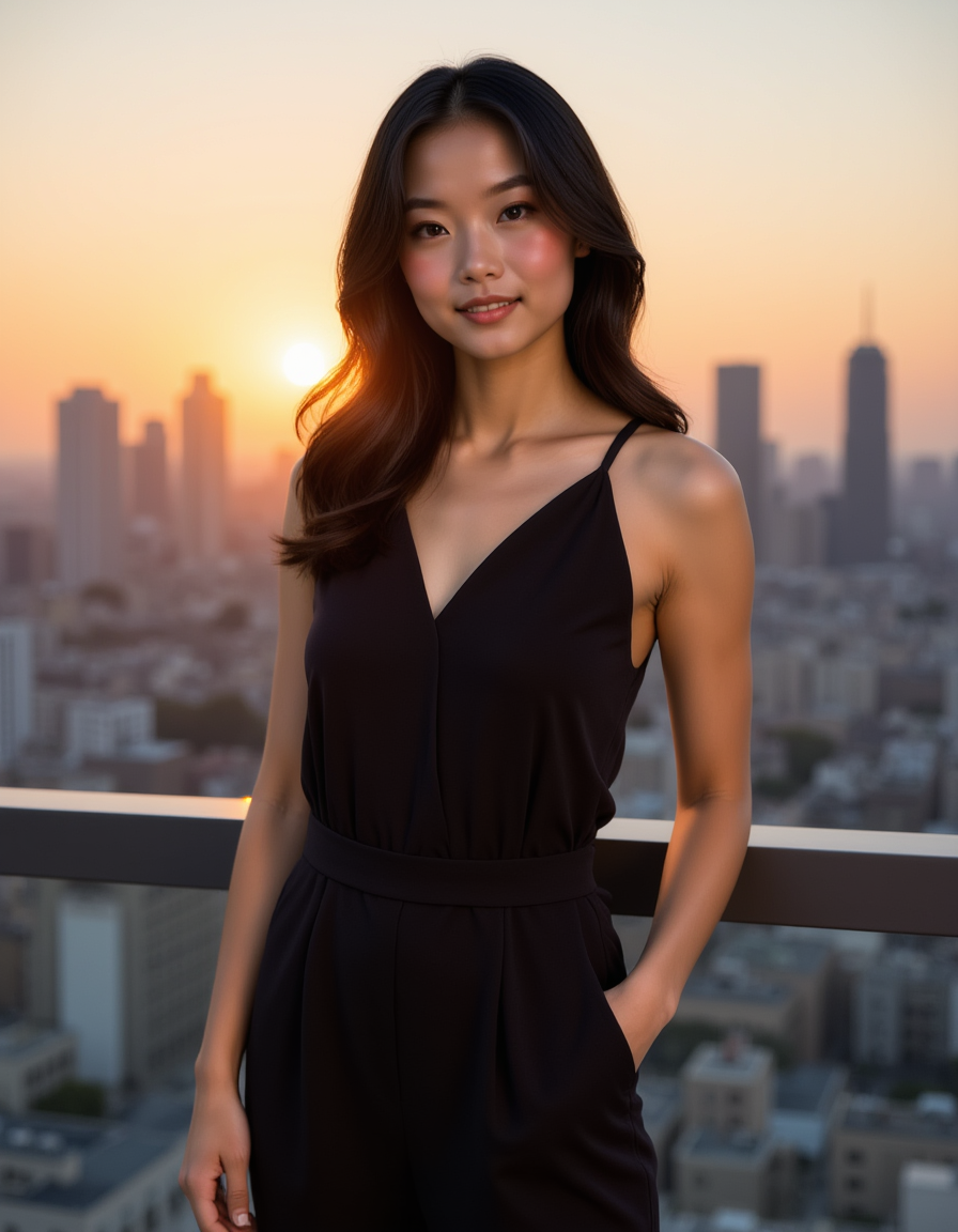 feminine model posing on a rooftop at sunset, wearing a sophisticated jumpsuit, city skyline blurred in the background, warm ambient lighting highlighting confidence and elegance