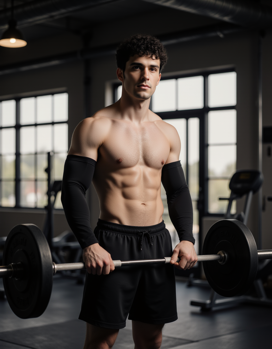 fit masculine model in gym shorts and compression sleeves, doing deadlifts, powerful stance, mirrored gym walls reflecting muscles, realistic skin texture, motivational vibe