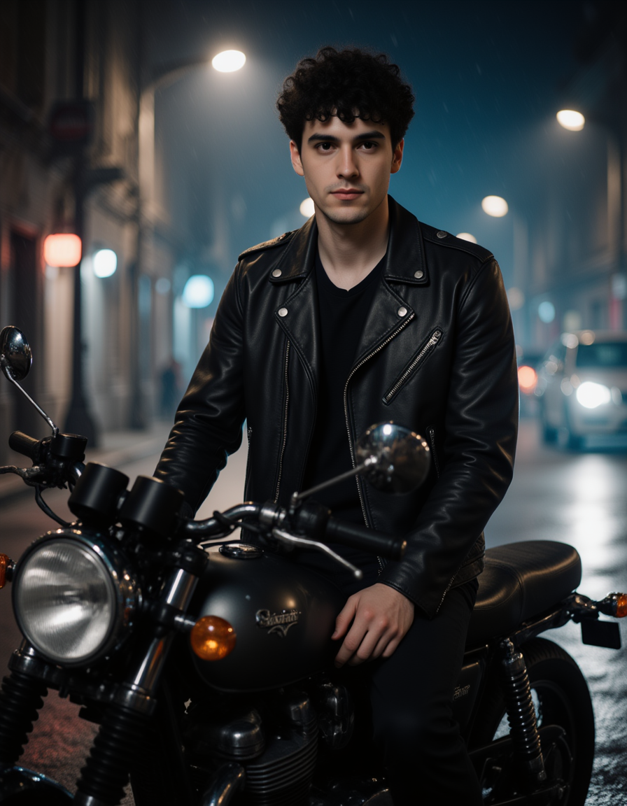 goth man in a leather jacket and chains, sitting on a vintage motorcycle under dim streetlights, smoke and rain creating a cinematic dark urban goth atmosphere.