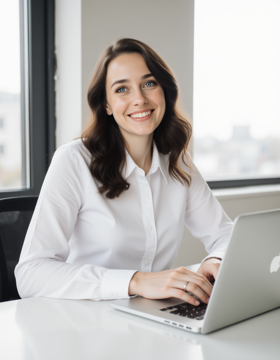 high-resolution headshot, model sitting at an office desk with a laptop, wearing a formal shirt and minimal jewelry, natural daylight from a window, clean professional composition, modern business aesthetic