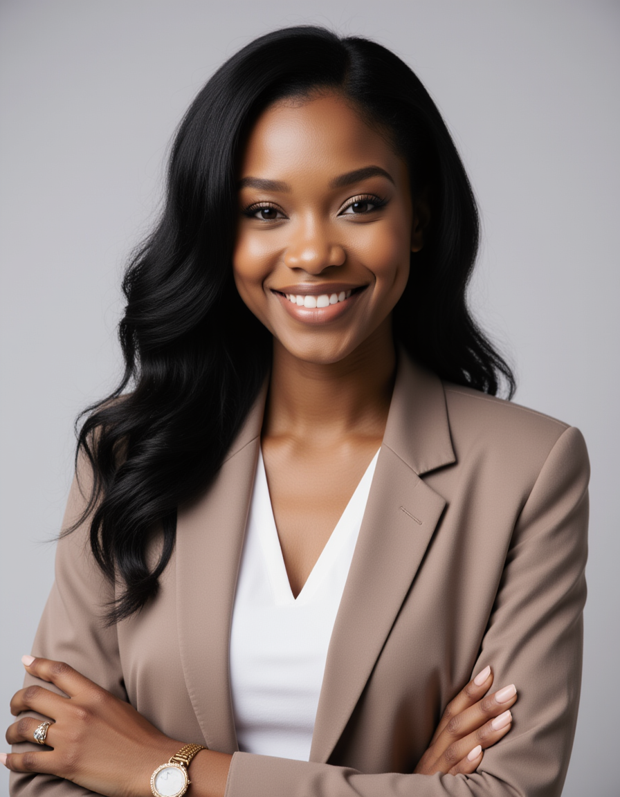 LinkedIn-ready headshot, model in neutral-toned professional attire, clean hairstyle, elegant jewelry, balanced studio lighting, sharp focus, neutral background, refined corporate elegance