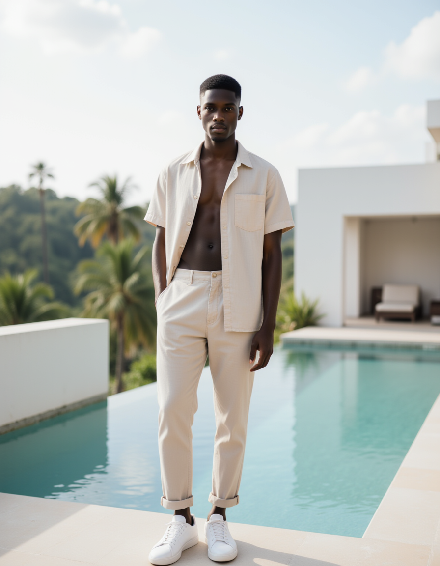 luxury Bali villa lifestyle portrait, modern resort outfit in neutral tones, standing beside an infinity pool, clean and confident influencer aesthetic