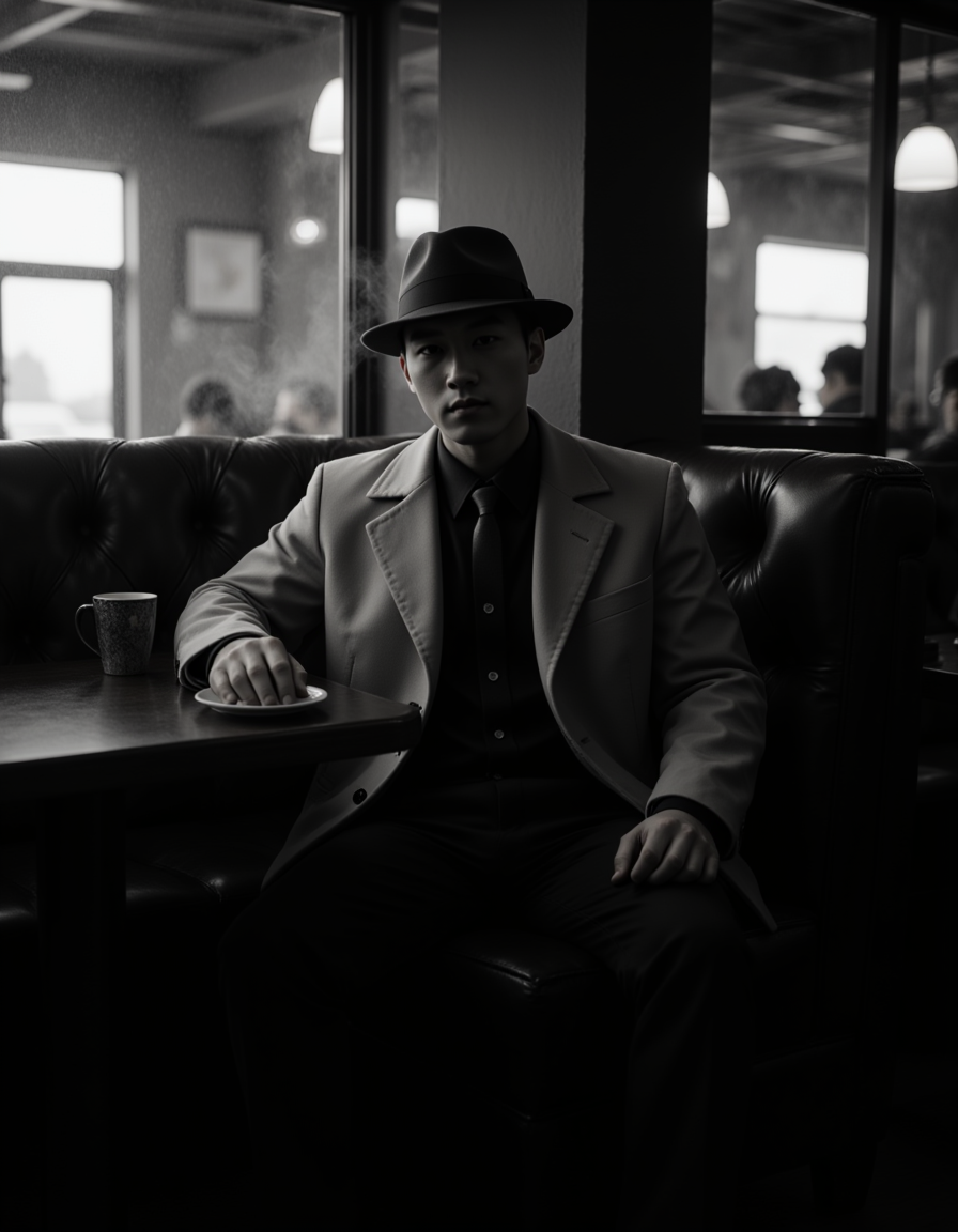 male model as a brooding detective sitting in a dimly lit diner, wearing a fedora and trench coat, coffee cup beside him, cigarette smoke rising through the neon reflections on the window, cinematic 1940s film noir style in black and white