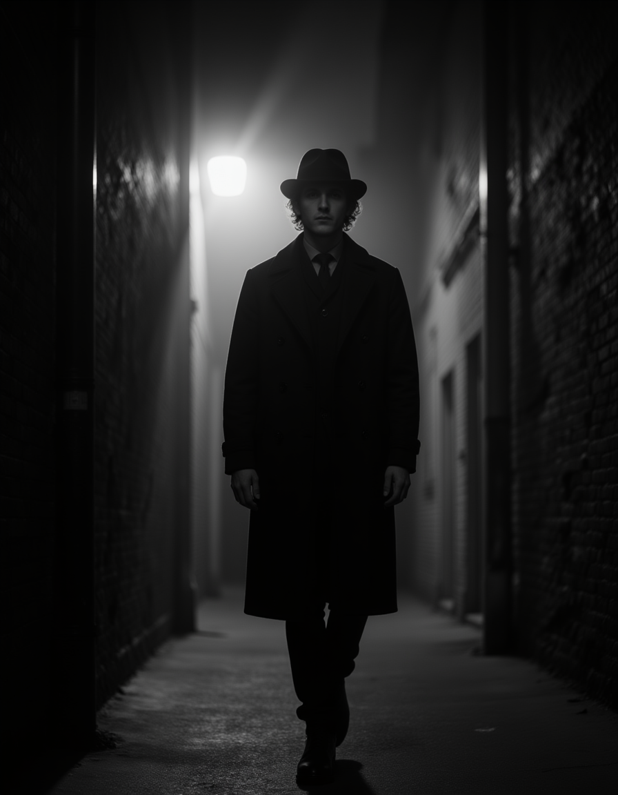 male model as a detective walking through a foggy alley at night, wearing a long trench coat and fedora, cigarette glowing faintly, streetlight casting harsh shadows, atmospheric black and white film noir scene