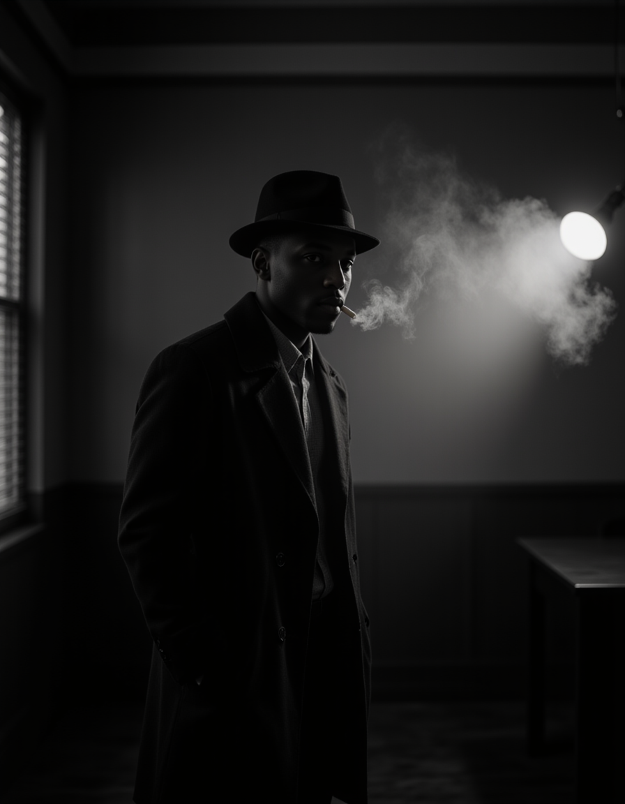 male model as a hard-boiled detective in a dimly lit office, wearing a fedora and trench coat, cigarette smoke curling through the air, venetian blinds casting sharp shadows across his face, moody black and white film noir lighting