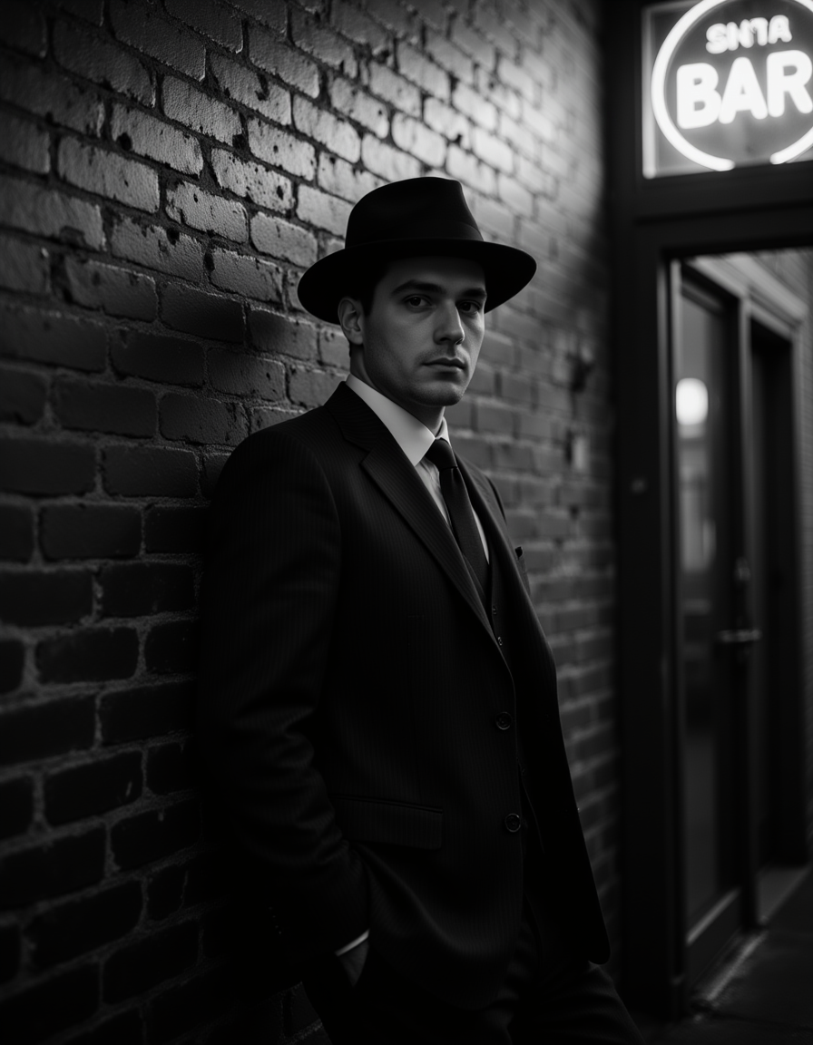male model leaning against a brick wall under a neon bar sign, wearing a pinstripe suit and fedora, subtle rain mist and soft backlight outlining his silhouette, gritty 1940s black and white noir aesthetic