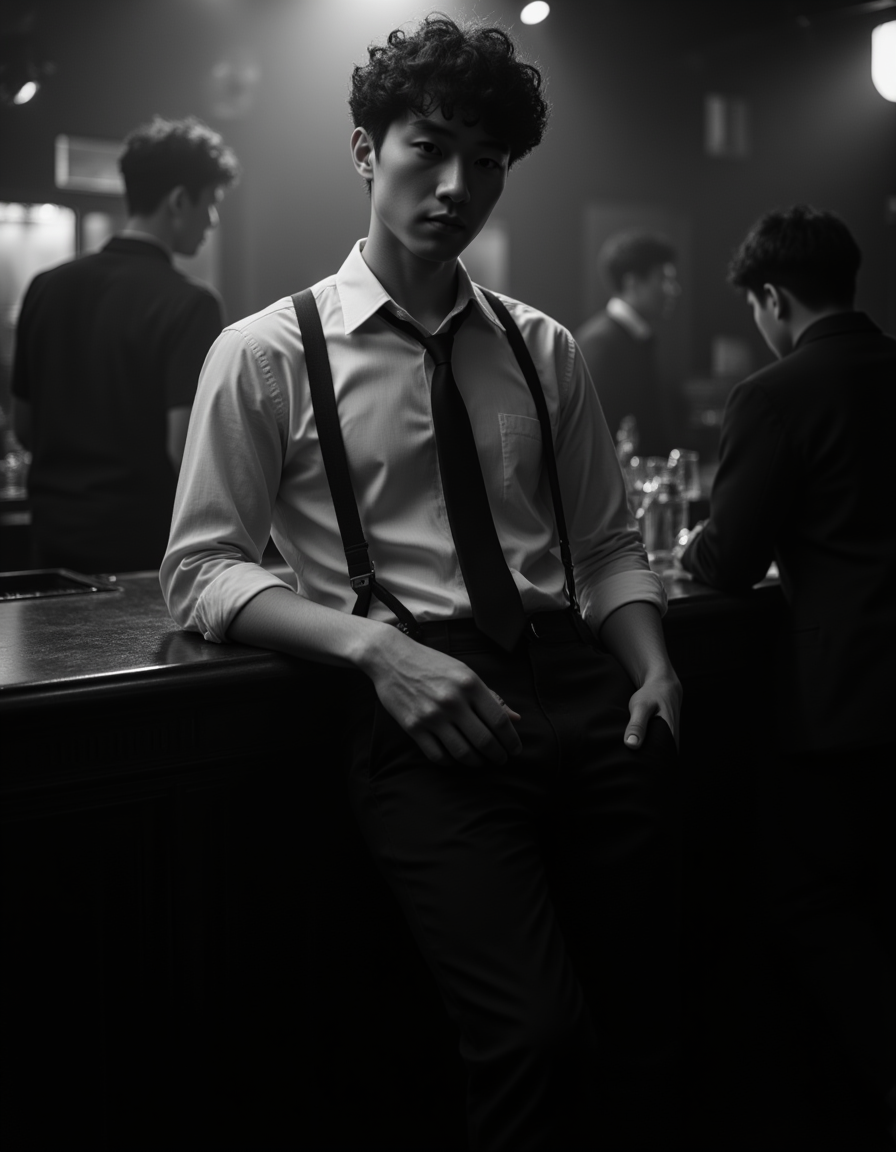 male model leaning on a bar counter in a smoky jazz club, wearing suspenders and a loosened tie, glass of whiskey in hand, shadows of musicians behind him, deep contrast and moody noir ambiance in black and white