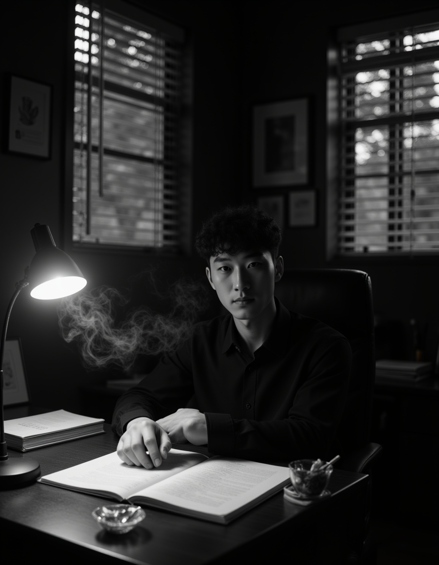 male model sitting at his desk under a single desk lamp, surrounded by old papers and an ashtray, cigarette smoke creating swirling patterns, strong venetian blind shadows across his face, classic black and white film noir photography
