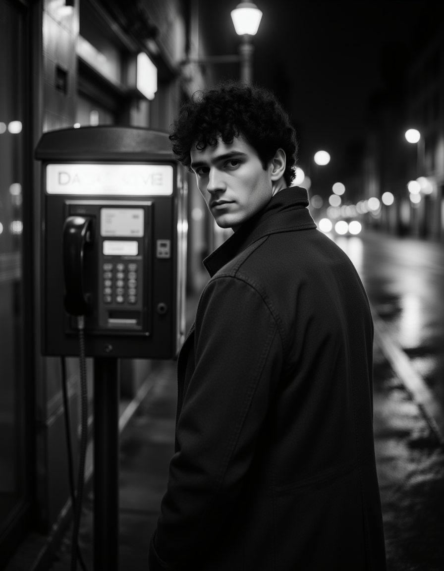 male model standing near a payphone on a deserted street, rain-soaked pavement reflecting city lights, trench coat collar turned up, mysterious expression, high-contrast black and white lighting in film noir style