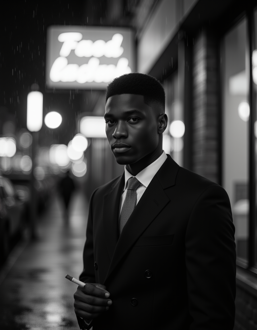 male model standing under a neon sign in the rain, wearing a classic 1940s suit and tie, holding a cigarette with a distant stare, reflections glistening on wet pavement, cinematic black and white noir atmosphere