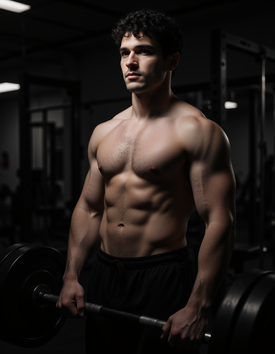 masculine model with broad shoulders and defined abs, lifting heavy barbells in a dimly lit gym, wearing tank top and shorts, intense focus on face, sweat dripping, photorealistic, high contrast lighting