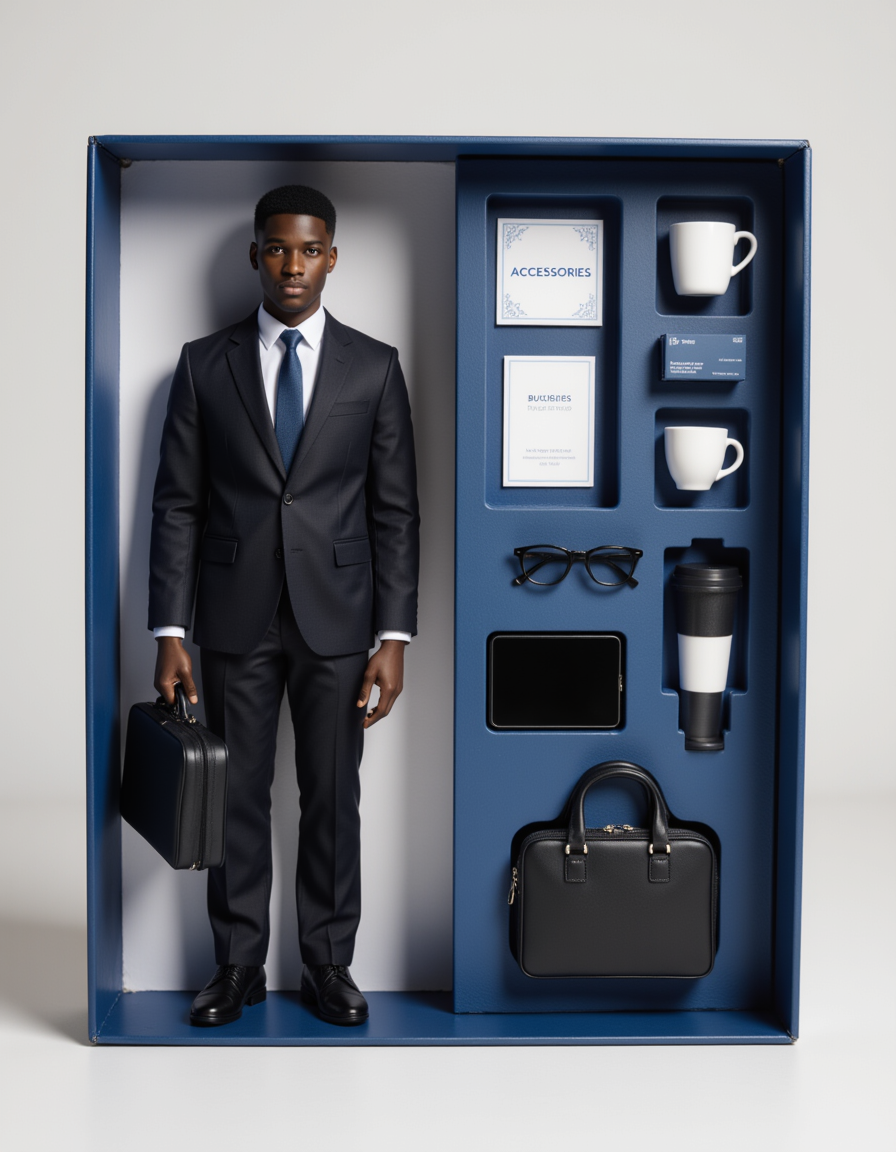 model as an action figure in packaging labeled 'BUSINESS TYCOON'. Use model as a reference for the face. Model is 6 inches tall and dressed in business suit, holding a briefcase. The cardboard section should be navy blue. Include an 'Accessories' section with items like tablet, business cards, and coffee mug. Make the design visually appealing and reflective of corporate world. Do not include the character image on packaging.
