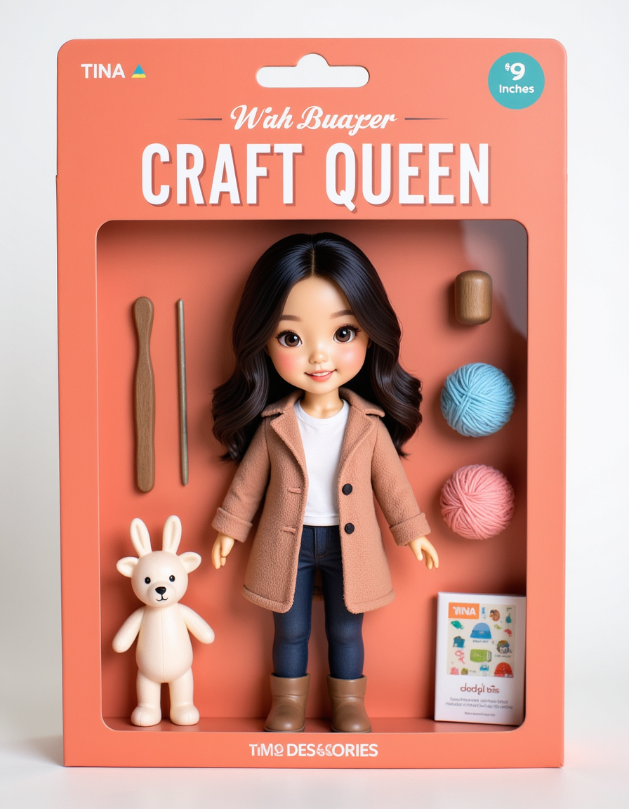 model as an action figure in packaging labeled 'CRAFT QUEEN'. Use model as a reference for the face. Model is 6 inches tall and dressed in cozy crafting attire, holding a knitting needle. The cardboard section should be warm coral. Include an 'Accessories' section with items like yarn ball, scissors, and craft pattern book. Make the design visually appealing and reflective of DIY crafting culture. Do not include the character image on packaging.