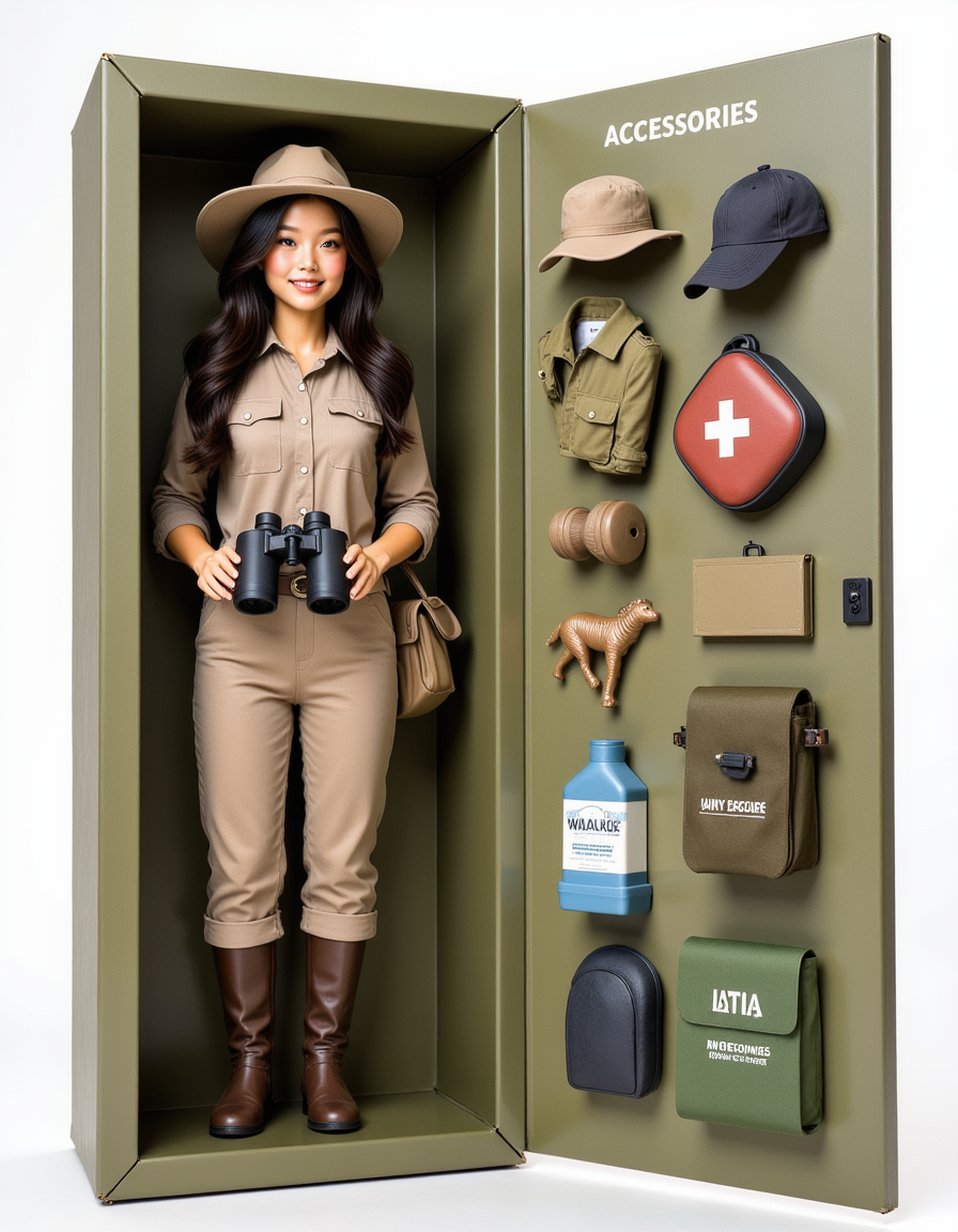 model as an action figure in packaging labeled 'WILDLIFE RESCUER'. Use model as a reference for the face. Model is 6 inches tall and dressed in safari-inspired attire, holding a pair of binoculars. The cardboard section should be olive green. Include an 'Accessories' section with items like first aid kit, water canteen, and animal guidebook. Make the design visually appealing and reflective of wildlife conservation culture. Do not include the character image on packaging.