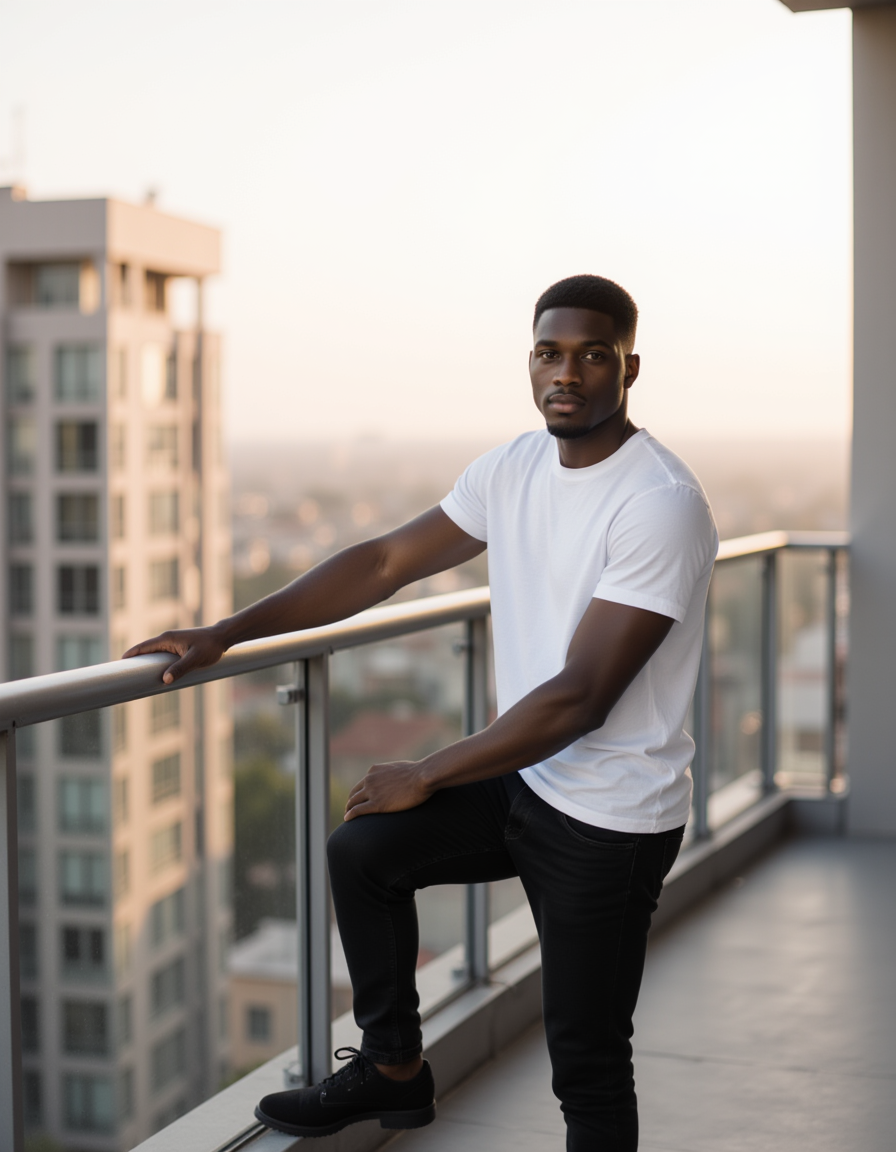 model on a balcony overlooking the city, relaxed stance with one hand on the railing, clean outfit, soft daylight creating a confident dating-profile look