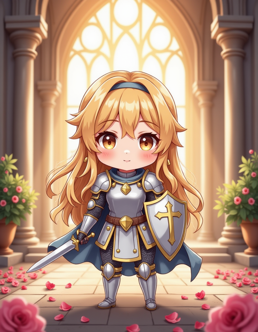The model as a chibi knight paladin, wearing shining silver armor with gold trim, a flowing cape, and a tiny sword and shield with holy symbols. Her hair flows from under a delicate helmet. The background is a grand cathedral with stained glass windows, divine light beams, and floating rose petals. The style is in cute chibi anime illustration.