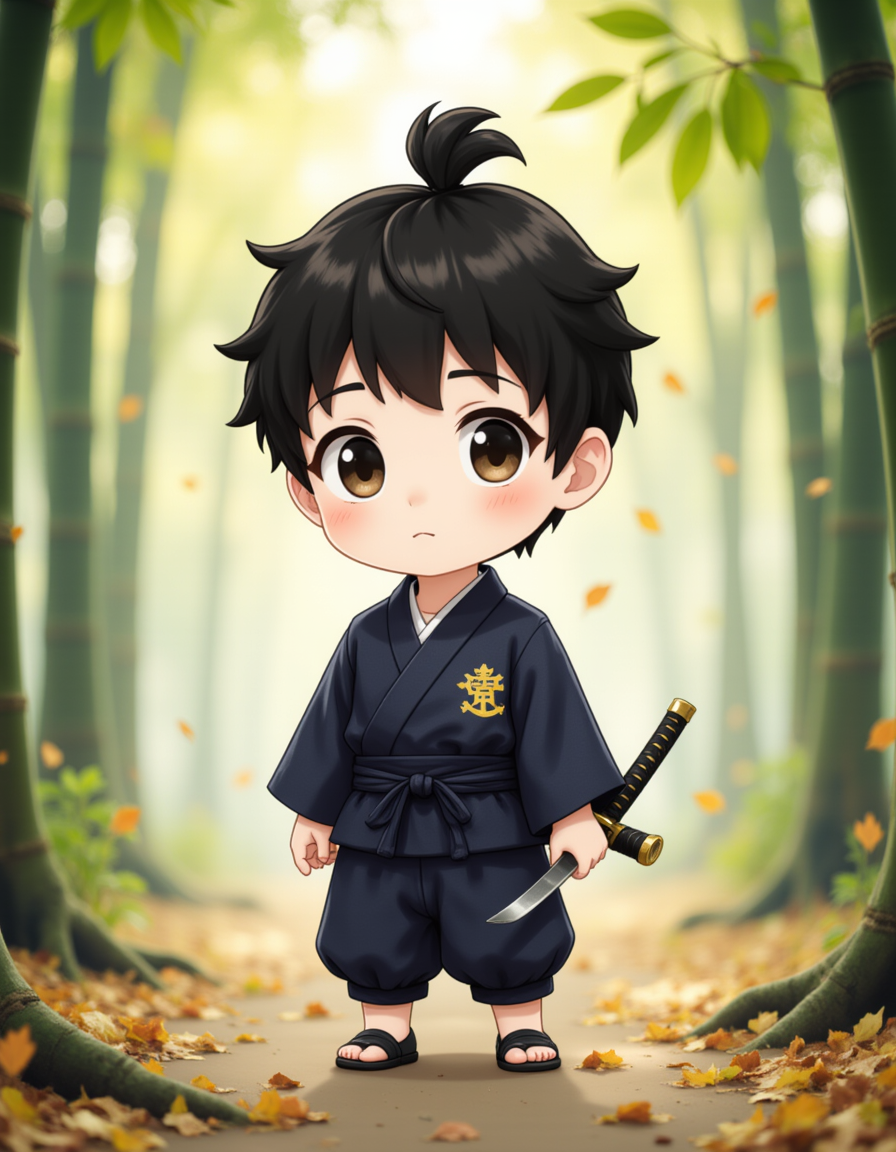 The model as a chibi samurai warrior, wearing traditional hakama pants and a mini haori jacket with a katana at his side. His hair is tied in a small topknot. The background is a serene bamboo forest with falling leaves and soft morning light. The style is in cute chibi anime illustration.